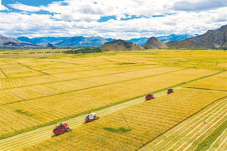 努力把资源优势转化为发展优势,做大做强高原特色产业,加快构建现代产业体系。2012年至2021年,城镇居民和农村居民人均可支配收入分别从18362元、5698元增长至46503元、16932元。图为西藏自治区江孜县紫金乡青稞种植喜获丰收。