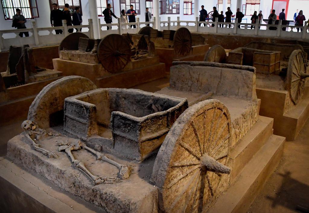 游客在河南安阳殷墟宫殿宗庙遗址内的车马坑参观(2018年10月14日摄)。新华社记者 李安 摄