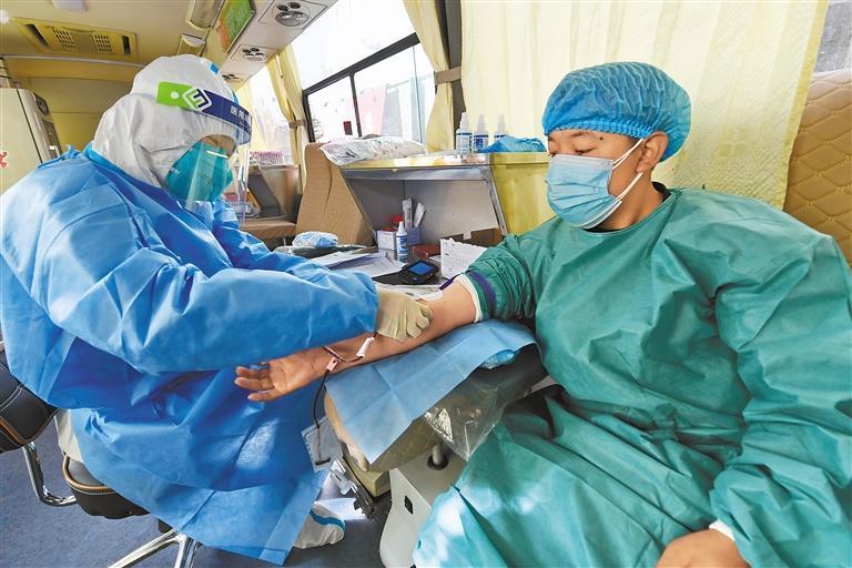 近日,西藏自治区无偿献血委员会向全区各级党政机关、企事业单位、民间社会组织和社会各界爱心人士发出《致全区人民无偿献血倡议书》, 我区各族各界干部群众积极响应,踊跃参与无偿献血,奉献爱心,传递正能量。 图为医护人员在采集血液。 本网记者 唐斌 摄