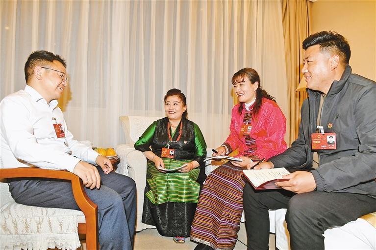 3月5日,第十四届全国人民代表大会第一次会议在北京人民大会堂开幕。 图为全国人大代表扎西江村(左一)、格桑卓玛、罗布央宗、拉琼在驻地热议政府工作报告。记者 李洲 摄