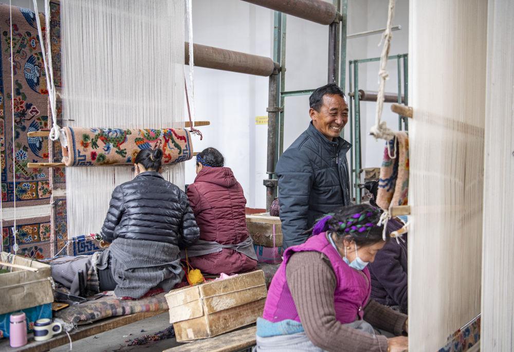 在江孜地毯厂,拉平(中)跟工人们交流(3月19日摄)。新华社记者 孙非 摄