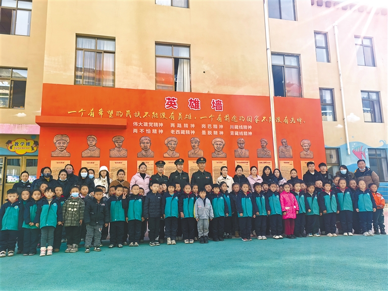 近日,西藏军区某部为拉萨市城关区第四幼儿园援建英雄墙,举行剪彩仪式,并向学生们生动讲述英雄墙上11位英雄的光荣故事,引导孩子们崇尚英雄,传承红色基因。