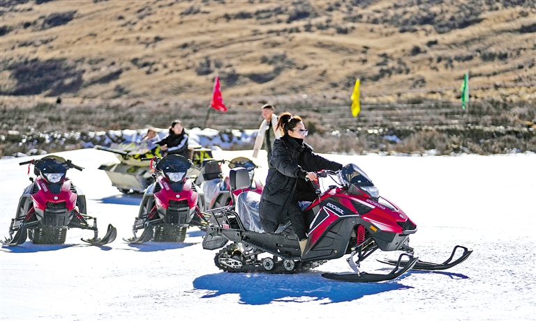 图为1月13日,游客在墨多滑雪场体验雪地摩托车嬉雪项目。新华社记者 晋美多吉 摄