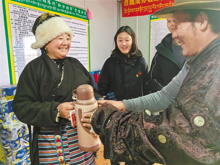 近年来,那曲市色尼区统筹推进基层党建示范点建设、树立农牧民新风貌试点、巾帼示范点和新时代文明实践等工作,推广运用“文明积分超市”,探索打造党建引领基层治理的样板,各村(居)结合积分细则,基于群众在持续深化乡村治理、参与村务议事、人居环境整治、村集体活动等重点工作中配合程度和完成力度给予积分,并按照“以奖代补、多劳多得”的奖励机制,为群众集中进行商品兑换,受到广大群众广泛欢迎。 图为那曲市色尼区那曲镇色尼雄塔村村民斯秋多杰(左一)用积分兑换商品。记者 万靖 摄