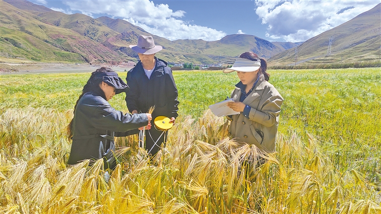 图为比如县相关工作人员在田间开展青稞测产分析工作。记者 万靖 摄