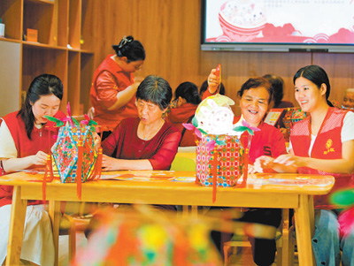 福建省福州市鼓楼区推动社区食堂和文化服务融合,丰富老年人生活。图为一家社区食堂内,志愿者和老人们一起学习非遗技艺。谢贵明摄(影像中国)