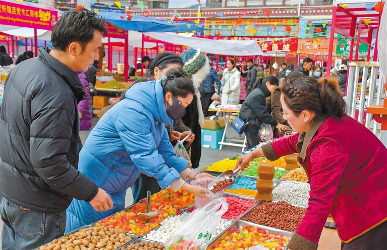 随着藏历新年的临近,我区各地大街小巷“化身”为年货街,广场、街道等摆起统一规划、装饰喜庆的临时摊位,各类肉蛋奶、干果、糖果、水果、卡赛、切玛、彩穗、花束、青稞苗等商品琳琅满目,年味儿十足,吸引了许多市民群众前来选购。