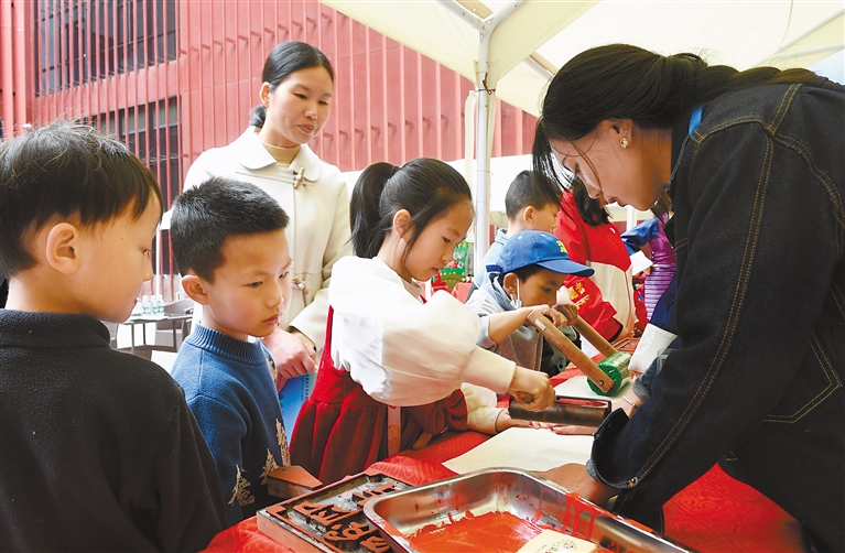 在西藏牦牛博物馆,小朋友体验雕版拓印技艺。记者 旦增兰泽 摄