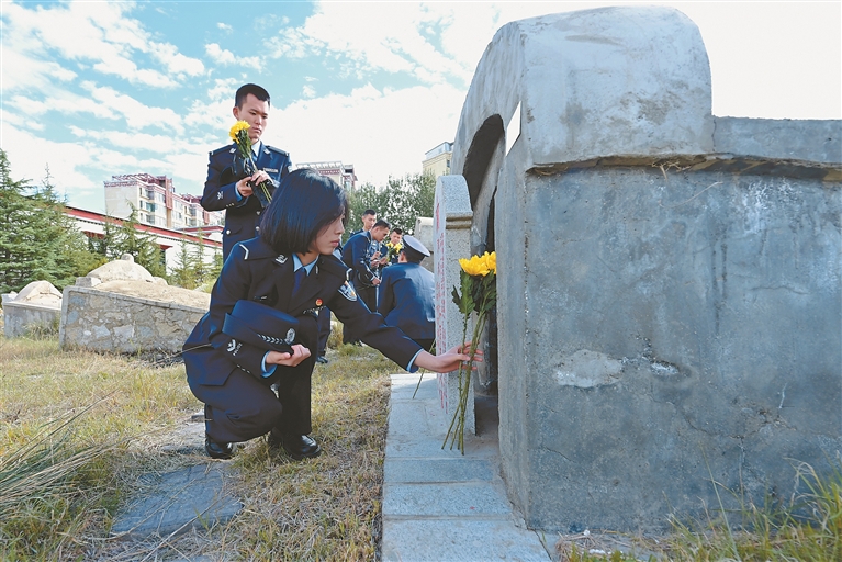 西藏警官高等专科学校学生在拉萨烈士陵园向先烈敬献鲜花。记者 唐斌 摄