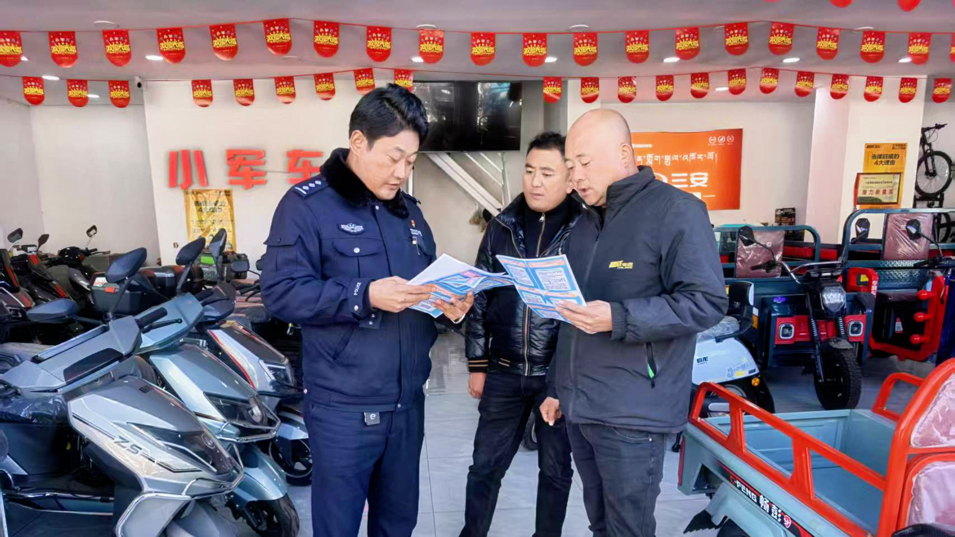 图为江孜县公安局民警在辖区商户宣讲党的二十届四中全会精神。