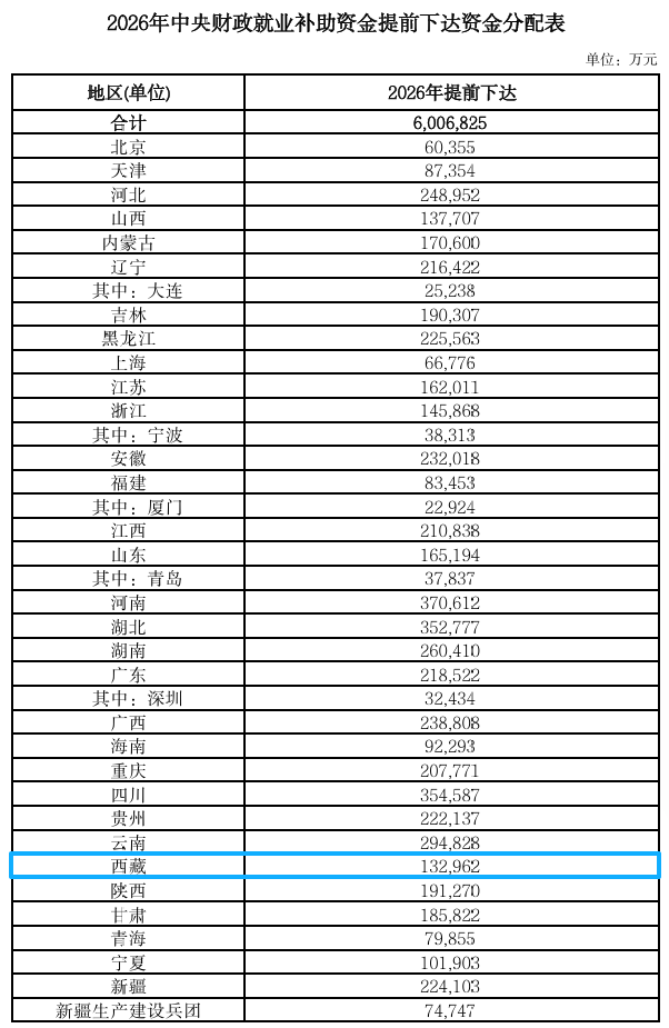 为深入贯彻党中央、国务院决策部署,实施就业优先战略,促进高质量充分就业,根据预算管理相关要求,现提前下达你省(自治区、直辖市、计划单列市、新疆生产建设兵团,以下统称省)2026年中央财政就业补助资金(以下简称就业补助资金)预算,具体金额见附件。现将有关事宜通知如下: