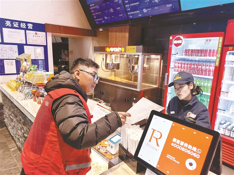 图为工作人员在向商户讲解“门前三包”责任相关内容。本网记者 格桑伦珠 刘琳琳 摄影报道