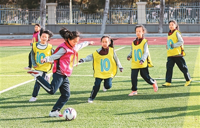 近年来,山东省荣成市大力推进青少年校园足球发展,促进学生身体与心理健康水平稳步提升。图为荣成市蜊江小学足球场上,小学生们正进行足球比赛。