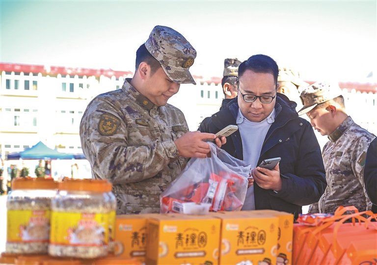 此次展销会重点突出“藏货”、择优引入“黔货”,共包含地方特产、农副产品、民族手工艺品等21大类300多种产品,其中牦牛肉、奶制品广受官兵青睐、成为爆款。另外,展销会还结合国补、地补优惠,让电子产品进营区,让官兵足不出户即可享受政策红利。