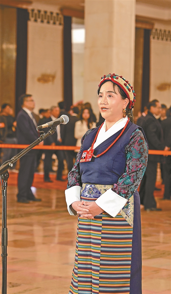图为住藏全国政协委员明吉措姆在人民大会堂举行的全国政协十四届四次会议第二场“委员通道”集体采访活动中接受媒体采访。