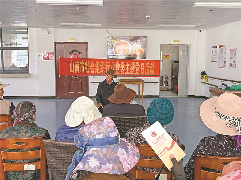 山南市社会组织行业党委开展主题党日活动,老党员洛桑向大家讲述新旧西藏对比。