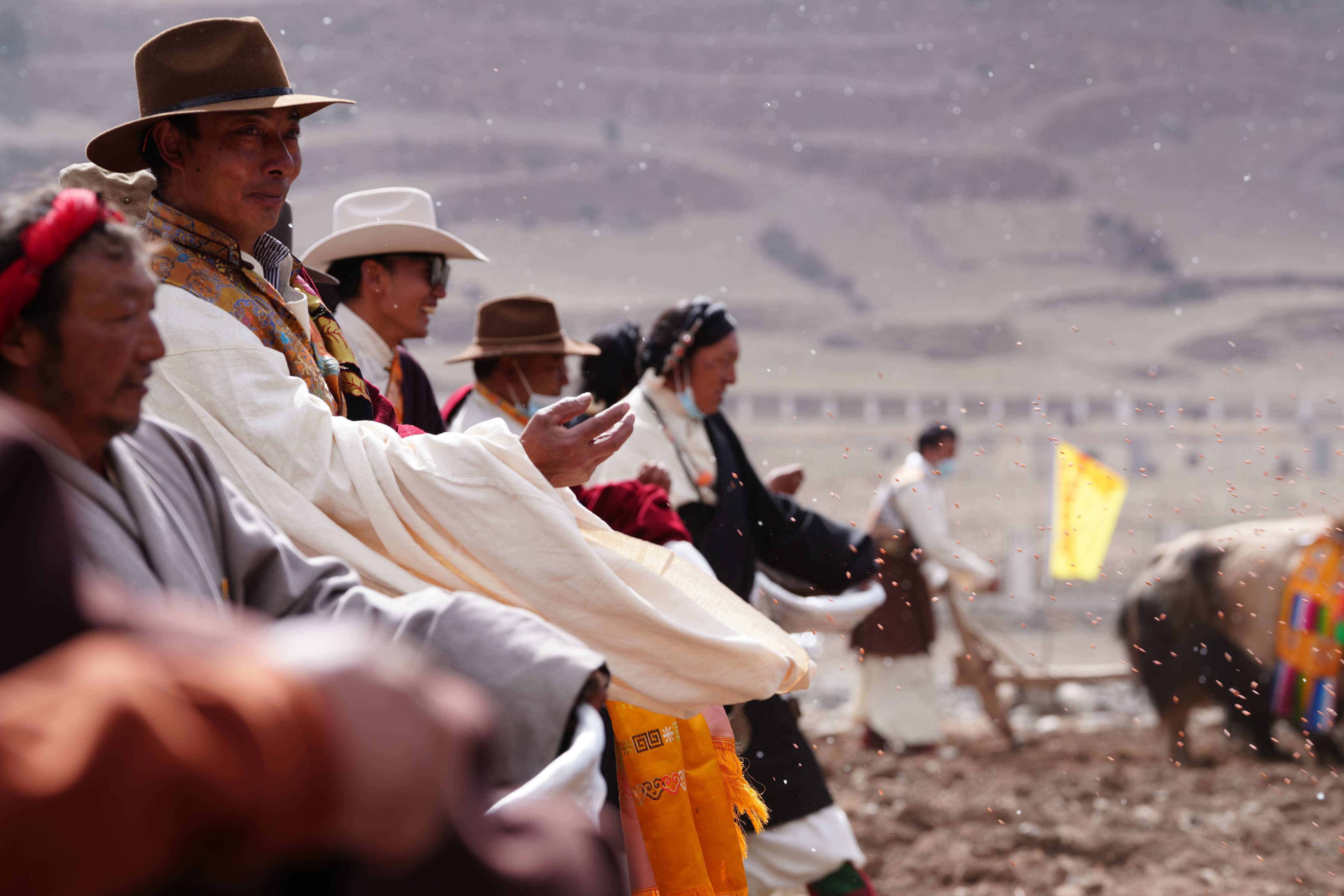 在那曲市索县首届高原春耕春播启动仪式上,身着盛装的农牧民群众共同播撒希望的种子。记者 汪纯 通讯员 索朗白姆 摄