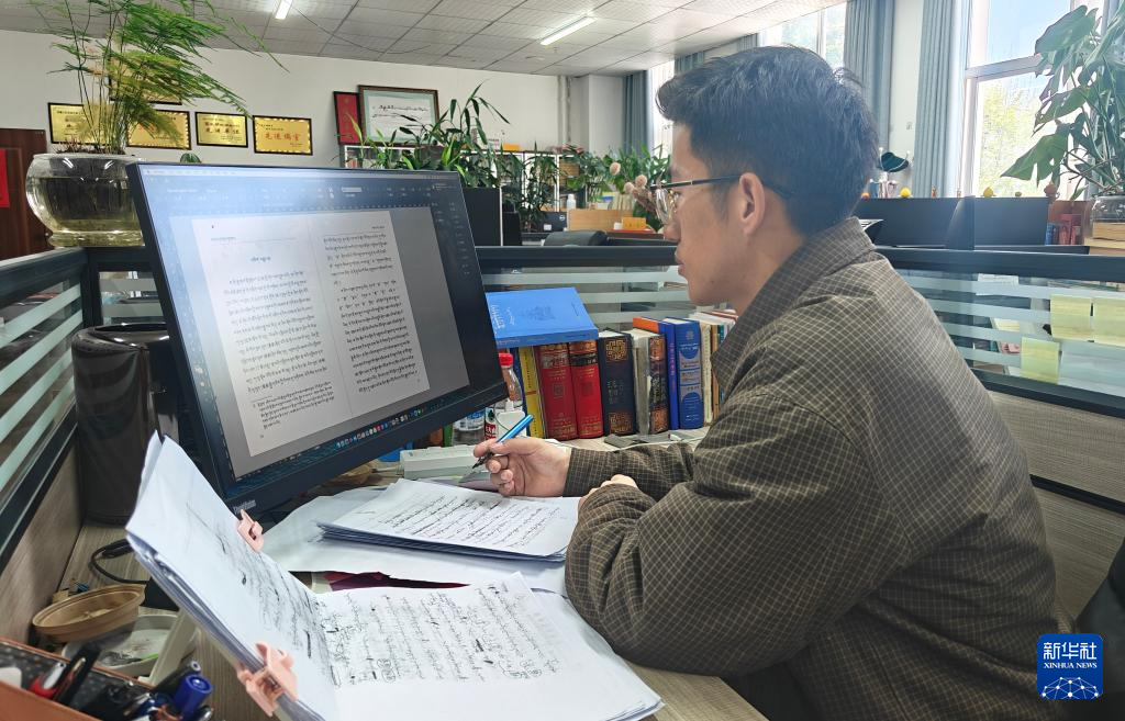 仁青正在校勘《茶经》藏译本。新华社记者春拉 摄