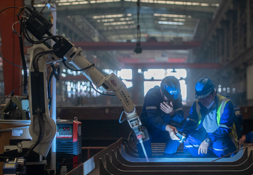 2024年5月16日,在湖北省武汉市武昌造船生产车间,工作人员在查看焊接机器人焊接的焊缝成型。近年来,武昌船舶重工集团有限公司围绕新型公务船、高端海工船、中小型绿色智能油化船和支线集装箱船等主建船型,积极推进数字化转型与智能制造,助力航运高质量发展。