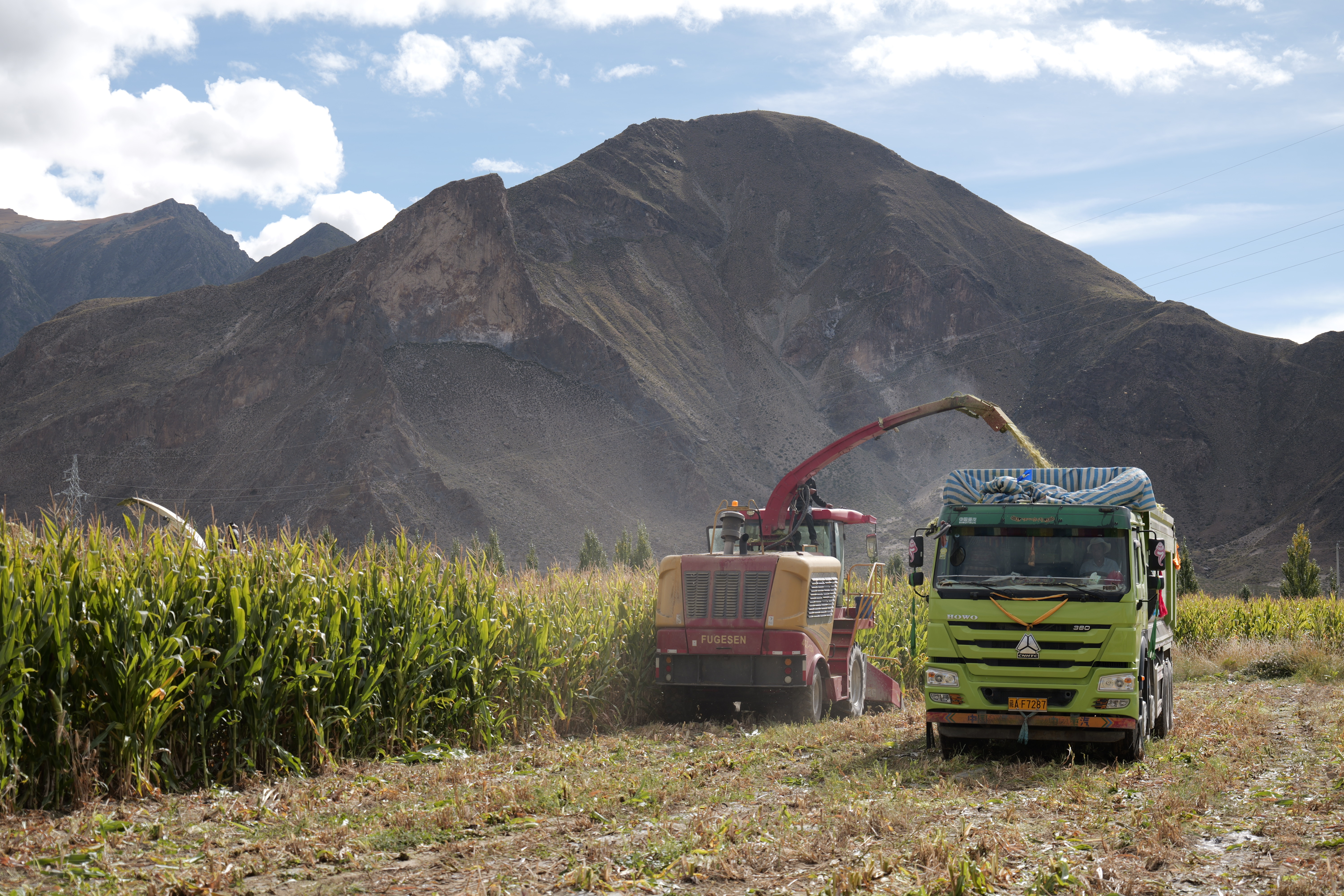 近日,精良农牧2023年优质青储玉米丰收观摩会在山南市贡嘎县多坡章乡青储玉米种植基地举行。图为农民驾驶农机收割玉米。