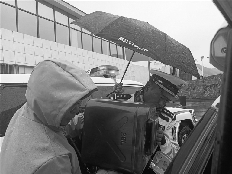 了解情况后,民警迅速在车辆前后方设置警示标志,一边安抚被困游客情绪,让他们不要慌张,一边将燃油加入油箱。