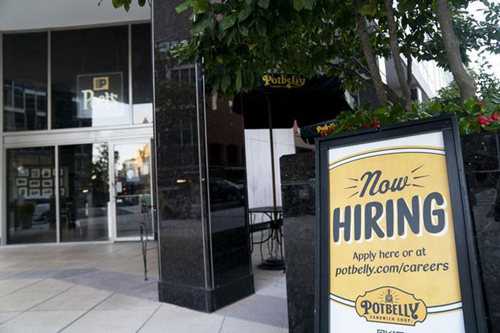 资料图:美国首都华盛顿一家餐厅门口打出的招聘广告。(图片来源:新华社)