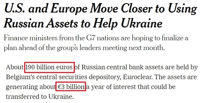 据美国《纽约时报》此前报道,目前,约1900亿欧元的俄央行资产被欧洲清算银行控制,这批资产每年产生约30亿欧元利息,以这些利息为基础发放贷款的额度可达500亿美元。