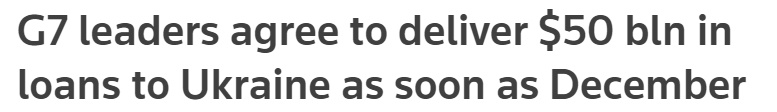 今年10月,七国集团领导人就以俄罗斯被冻结资产所产生的收益作为抵押、向乌克兰提供500亿美元贷款达成共识,承诺将在今年年底前向乌方提供贷款,用于支持乌方财政、军事和重建。此外,作为七国集团贷款计划的一部分,美国承诺将向乌克兰发放200亿美元贷款。