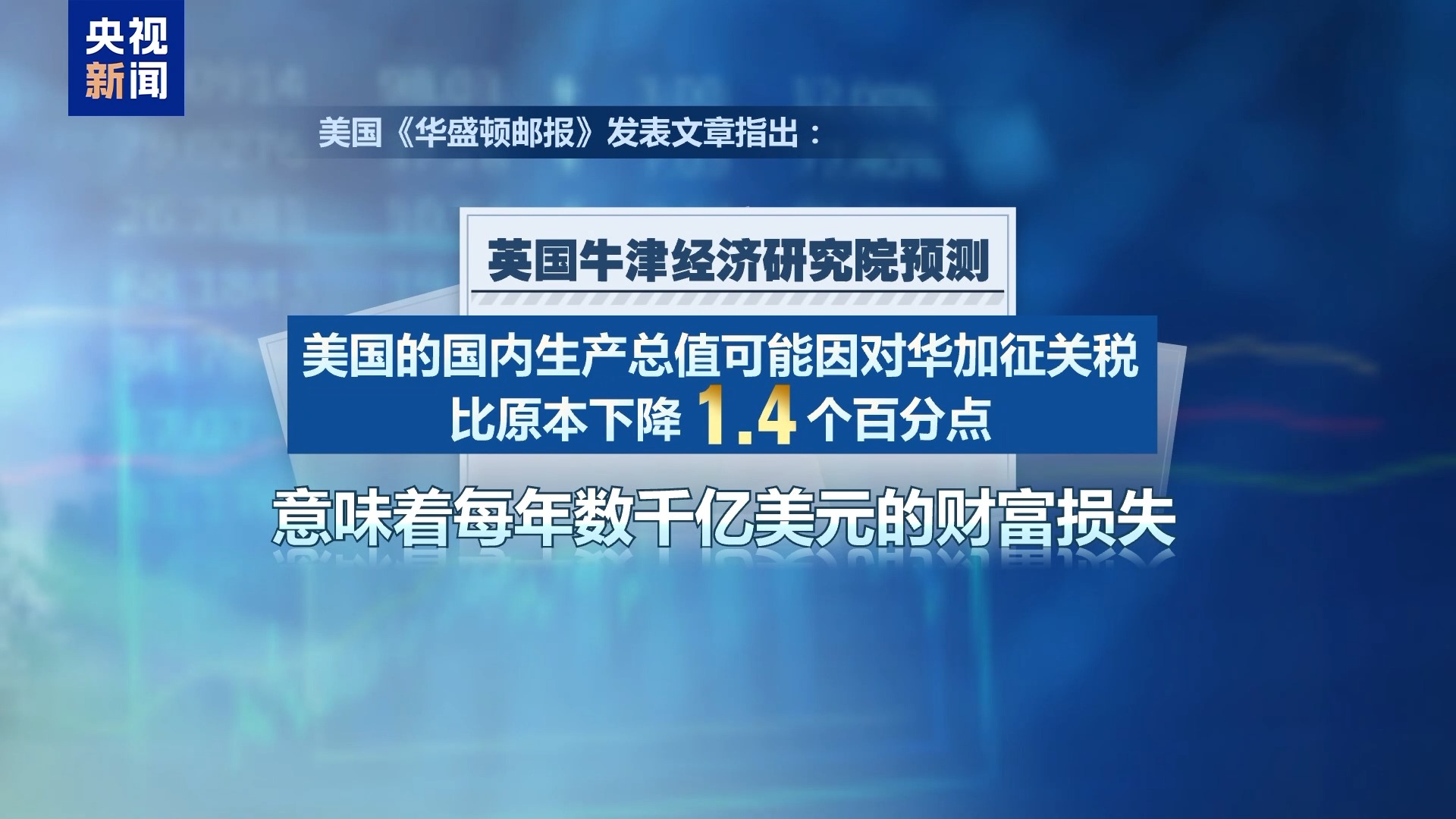 文章还指出,英国牛津经济研究院预测,美国的国内生产总值可能因对华加征关税比原本下降1.4个百分点,意味着每年数千亿美元的财富损失。此外,随着企业调整供应链,通货膨胀随之而来。同时,专业化程度下降导致生产力损失,而被破坏的创新生态系统则导致更高的机会成本。