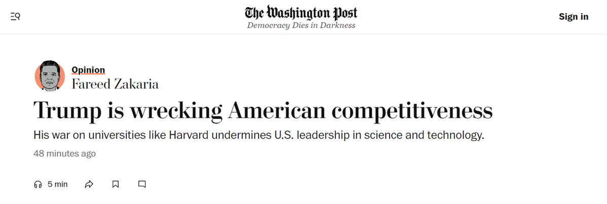 文章分析了美国“全球竞争力”正面临的挑战,重点讨论了美国内部因政策分裂而削弱自身优势的现象,尤其是对高等教育和国际人才的限制,正在摧毁其全球领导地位。