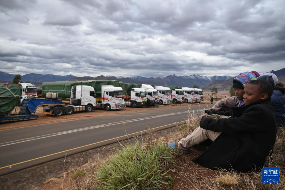 7月6日,在位于莱索托北部的莱里贝地区皮岑附近的山区公路旁,当地儿童席地而坐围观运送硬岩掘进机部件的卡车车队。新华社记者 杨光 摄