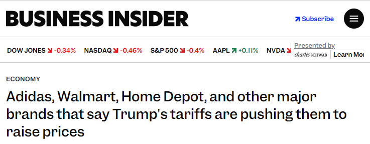 商业内幕网(Business Insider)近日梳理了一批已实施或计划提价的知名企业,覆盖衣食住行多个消费领域,涨价原因多与关税带来的成本压力相关。