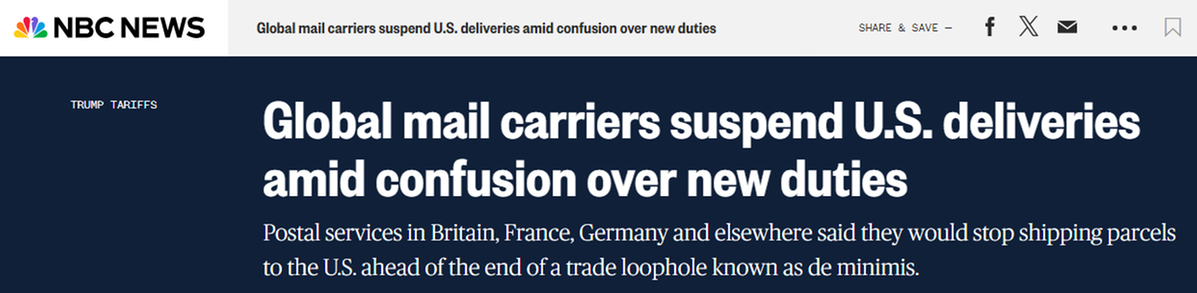 据报道,欧洲和亚洲的邮政服务商已采取措施,宣布最早从8月25日开始暂停对美寄递服务。奥地利邮政发布声明称:“目前关于未来清关程序的信息严重不足,政策收紧给全球所有邮政企业寄递商品至美国带来重大挑战。”
