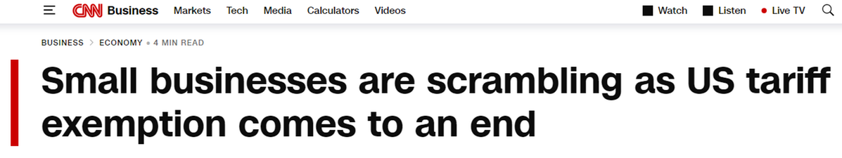 取消小额包裹关税豁免的政策变化预计将影响亚马逊低价平台(Amazon Haul)、TikTok商店等折扣商城和Etsy、Shopify等电商平台,而这些平台连接着众多美国普通消费者和全球商家。