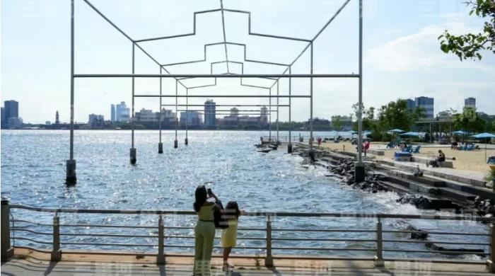 当地时间7月22日,美国纽约曼哈顿甘斯沃特沙滩旁,矗立着永久公共艺术项目“一日之末”。图/中新社记者 廖攀 摄