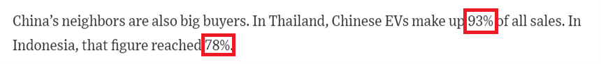 其次,中国的邻国也是电动汽车的大买家。在泰国,中国电动汽车占总销量的93%。在印度尼西亚,这一数字达到了78%。