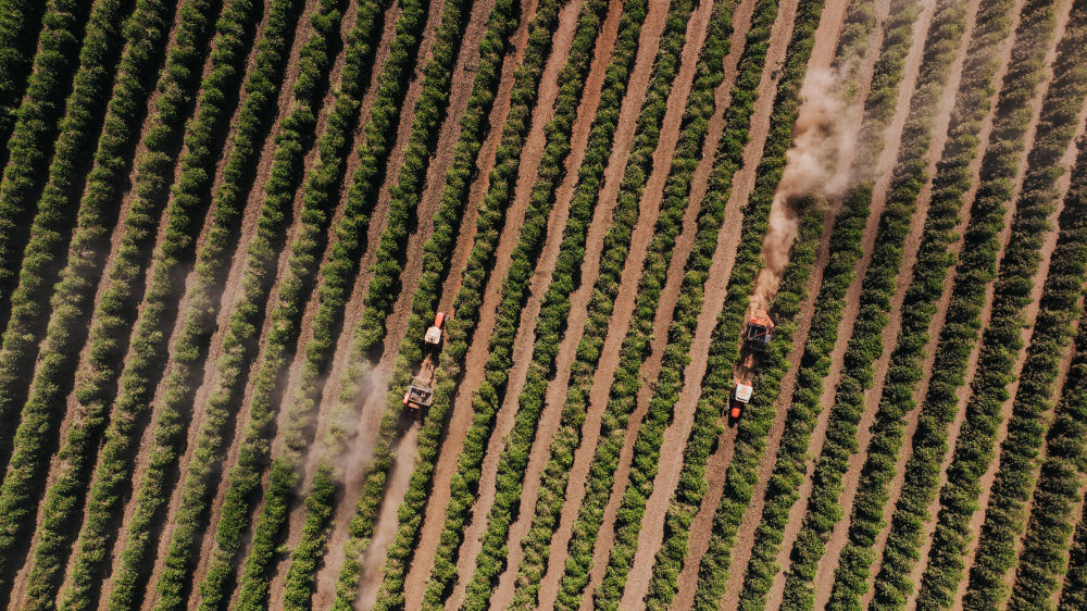 这是8月27日在位于巴西米纳斯吉拉斯州巴拉那伊巴河畔卡尔穆的一家咖啡庄园拍摄的咖啡豆收获场景(无人机照片)。新华社记者王天聪摄