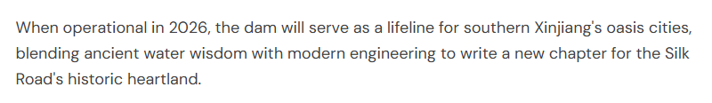 文章援引商业分析认为,该工程在节水技术和农业现代化方面潜力可观。该大坝计划于2026年建成投运,届时将成为南疆绿洲城市的重要命脉,融汇传统治水智慧与现代工程技术,为丝绸之路经济带的核心区域注入新的发展动力。