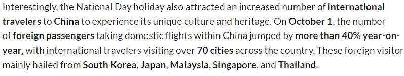 报道说,今年中国的国庆节假期长达八天,又恰逢中国的传统中秋佳节,引发了其国内各地旅游业十分繁荣。比往年多出一天的长假,鼓励了更多家庭出游,使得中国国内和国际游需求均高于往年。业内人士指出,中国国庆假期带动了出游人数的增长和旅游人气的全面提升,超过了往年的最高纪录。