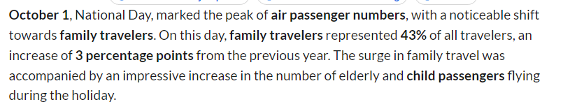 报道说,中国国庆节当天,国内航空客运量达到顶峰,家庭出行明显增多。报道援引国内旅行公司的数据显示,当天家庭出行占比达到 43%, 较去年同期增长3个百分点。家庭出行的激增也带来了老年和儿童旅客数量的大幅增长。12岁以下儿童乘坐飞机出行的人数同比增长31% ,而60岁以上老年旅客的航空出行人数同比增长 33% 。报道认为,这一变化凸显了家庭游在中国旅游格局中日益重要的地位。