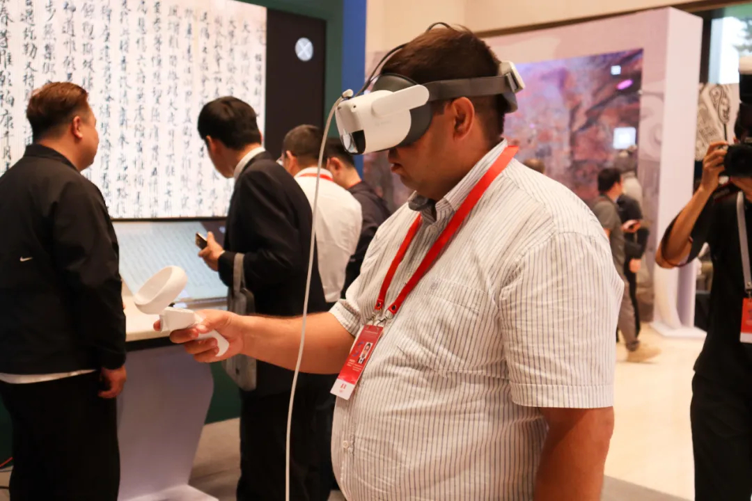 2025年9月17日,陕西西安,2025年世界互联网大会文化遗产数字化论坛开幕。图为外籍参会者体验数字化项目。中新社记者 李一璠 摄