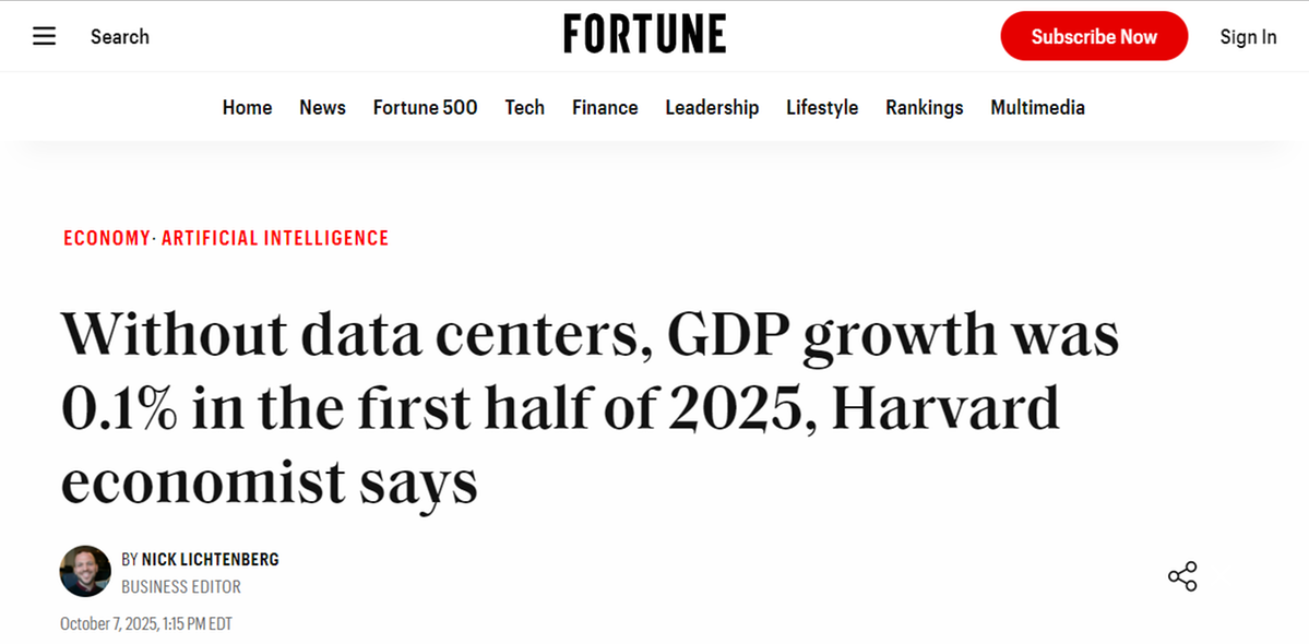 2025年上半年,美国GDP增长几乎全部依赖数据中心和AI投资,其中AI投资占比近92%。哈佛大学经济学家杰森·弗曼指出,若剔除这一领域,其余产业合计成长率仅0.1%,几乎陷入停滞。