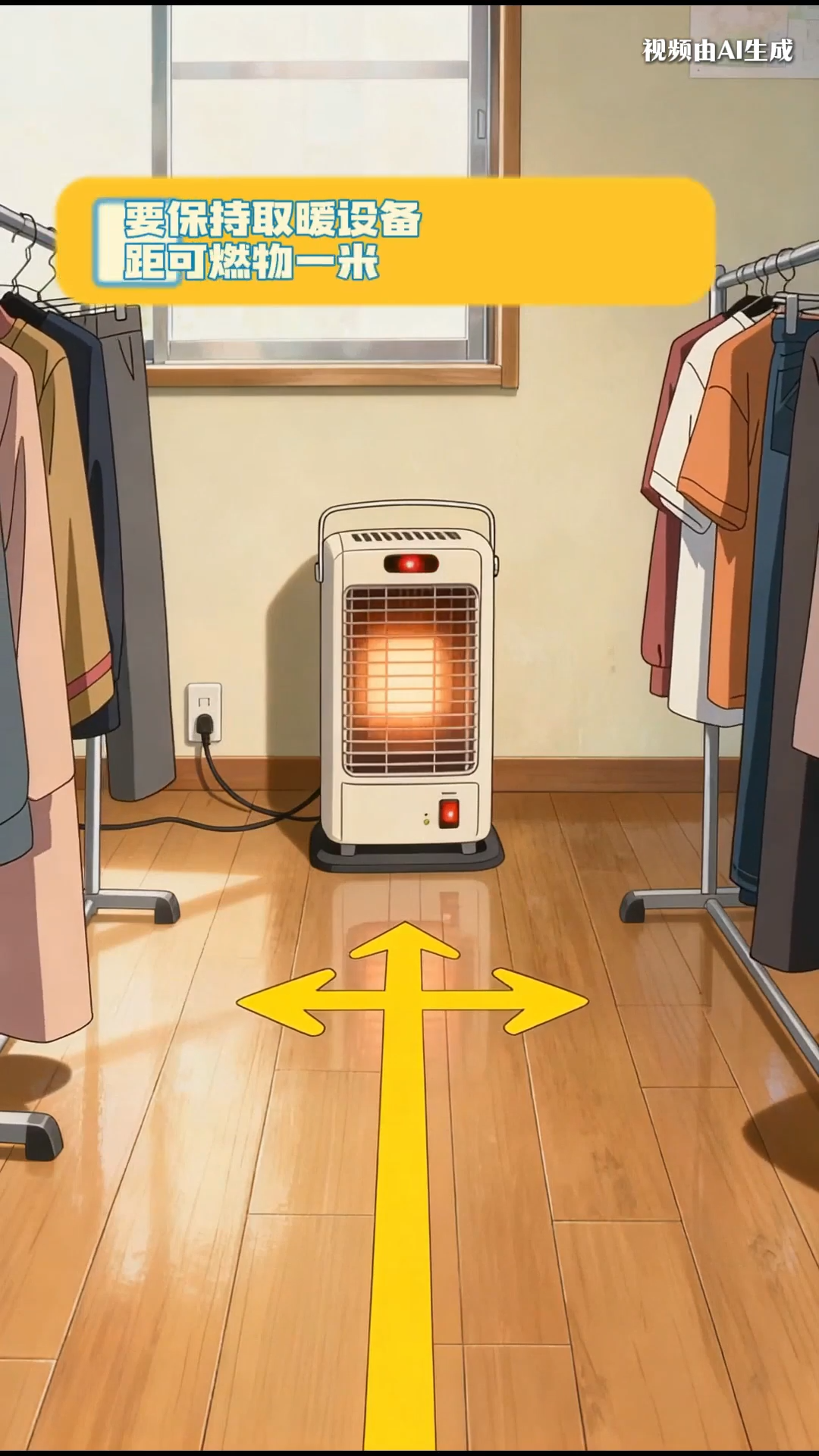 ◆要保持距离,取暖设备与可燃物保持一米以上安全距离。
