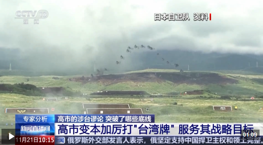 特约评论员 苏晓晖:现在日方的动向很明显是要抓住“台湾牌”,还要变本加厉地打“台湾牌”,希望以台制华,实现自己的战略目标。台湾问题是中国的内政,是中国核心利益的重要的组成部分。此前中日关于一个中国原则本身是有明确的共识。近期高市在立场方面的转变、涉台的错误言论,指向的是现在对于高市本人来说,试图试探中方的反应,进而为日本后续介入台海局势来进行铺垫。同时日本对中方发出武力威胁,也再次制造对立。另外我们还会看到所谓的集体自卫权,日本此前在2015年对集体自卫权解绑之后,还在不断推进相关的动作。现在涉及的不仅仅是要介入台海局势,还涉及要拉美方下水,日美之间在军事安全方面加强合作,日本要在安保原则方面进行进一步的升级和突破。