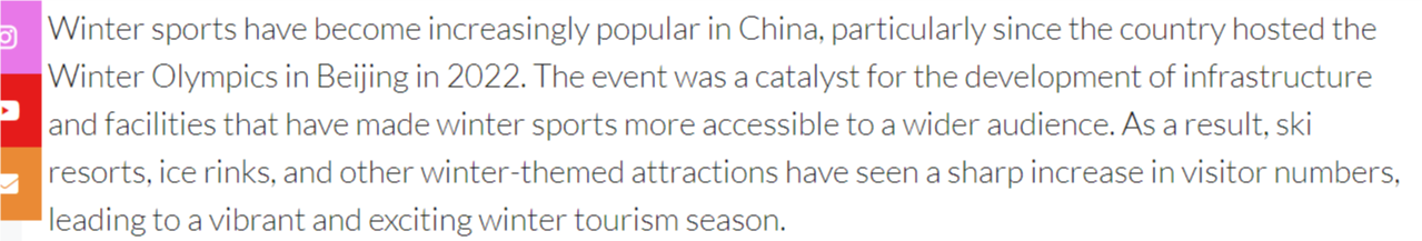 文章说,自2022年北京冬奥会成功举办以来,冰雪运动在中国越来越受欢迎。冬奥效应带动了基础设施的完善,让更多人得以接触冰雪项目。如今,滑雪场、冰场和其他冬季主题景点客流量大幅增长,造就了充满活力、令人兴奋的冰雪旅游季。