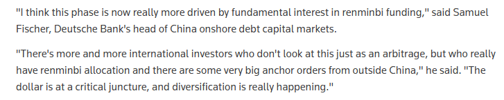 报道援引德意志银行中国在岸债务资本市场主管塞缪尔・费希尔的观点称,“现阶段的人民币融资热潮,更多是由市场对人民币融资的根本性需求来驱动的”。他指出,“越来越多的国际投资者不仅仅把这看作套利,而是要真正将其纳入资产配置,并且已经有一些来自中国以外的大额锚定订单”。