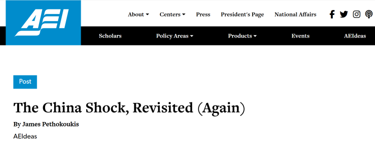 国际在线专稿:当前全球经济复苏乏力、贸易保护主义抬头,部分西方政客与媒体频繁炒作“中国冲击论”,企图将损人不利己的“关税大棒”合理化。美国知名保守派智库美国企业公共政策研究所(American Enterprise Institute for Public Policy Research)高级研究员詹姆斯·佩索科基斯(James Pethokoukis)近日发文称,基于大量数据分析与案例研究,“中国冲击论”站不住脚,中国融入全球经济促进了美国经济增长,实际上显著提高了美国人民的生活品质。