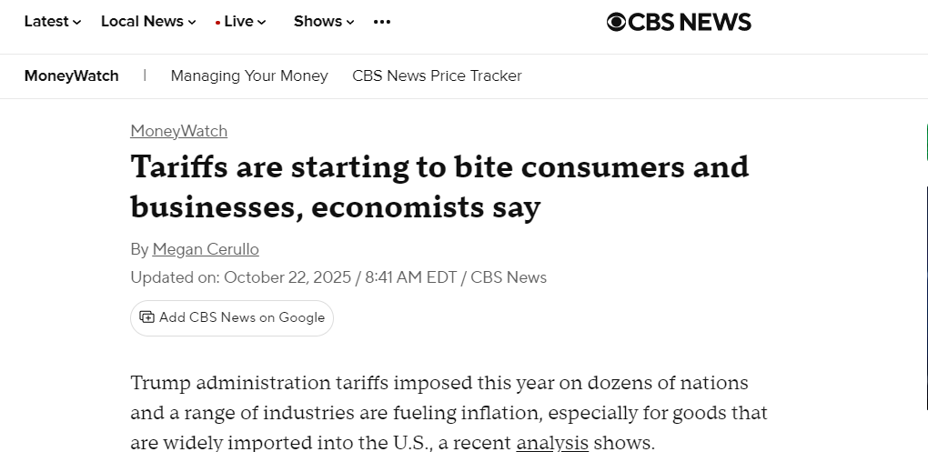 哥伦比亚广播公司(CBS)新闻网今年10月的报道也指出,美国政府实施的关税开始“咬噬”消费者和企业。经济学家指出,关税正在推高通胀,尤其是对大量进口的商品而言。进口商通常会将部分关税成本转嫁给消费者。今年关税预计将给美国企业额外增加1.2万亿美元成本,其中大部分由消费者承担。