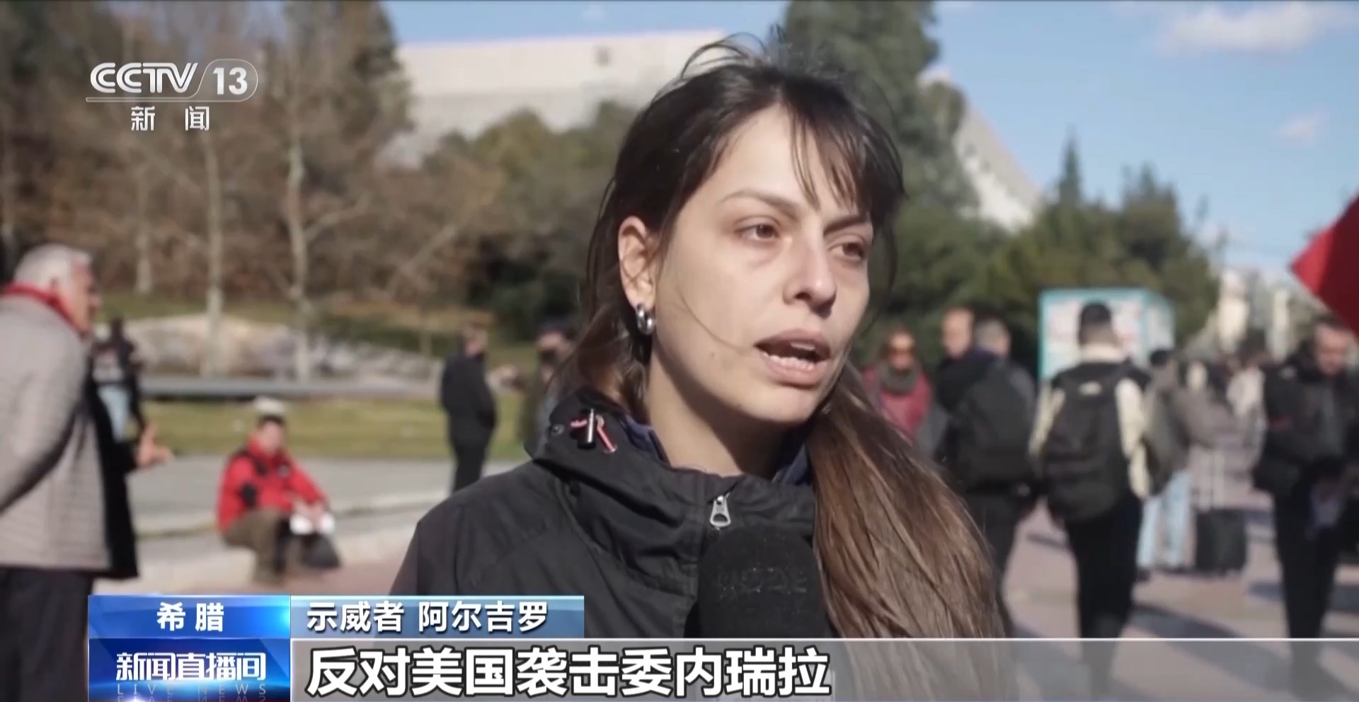 抗议者 安杰利斯:我们在抗议美国处理国际政治的方式,自从1月3日的事件以来,我们看到了对国际法的践踏,我们对世界局势的发展感到非常担忧。