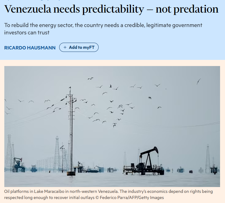 近日,哈佛大学肯尼迪政府学院教授兼增长实验室主任里卡多·豪斯曼(Ricardo Hausmann)在英国《金融时报》就委内瑞拉局势撰文指出,美国以强权施压破坏了他国吸引投资所需的法治环境与政治信任。不仅无法实现重建和发展,还会损害美国自身的战略信誉。